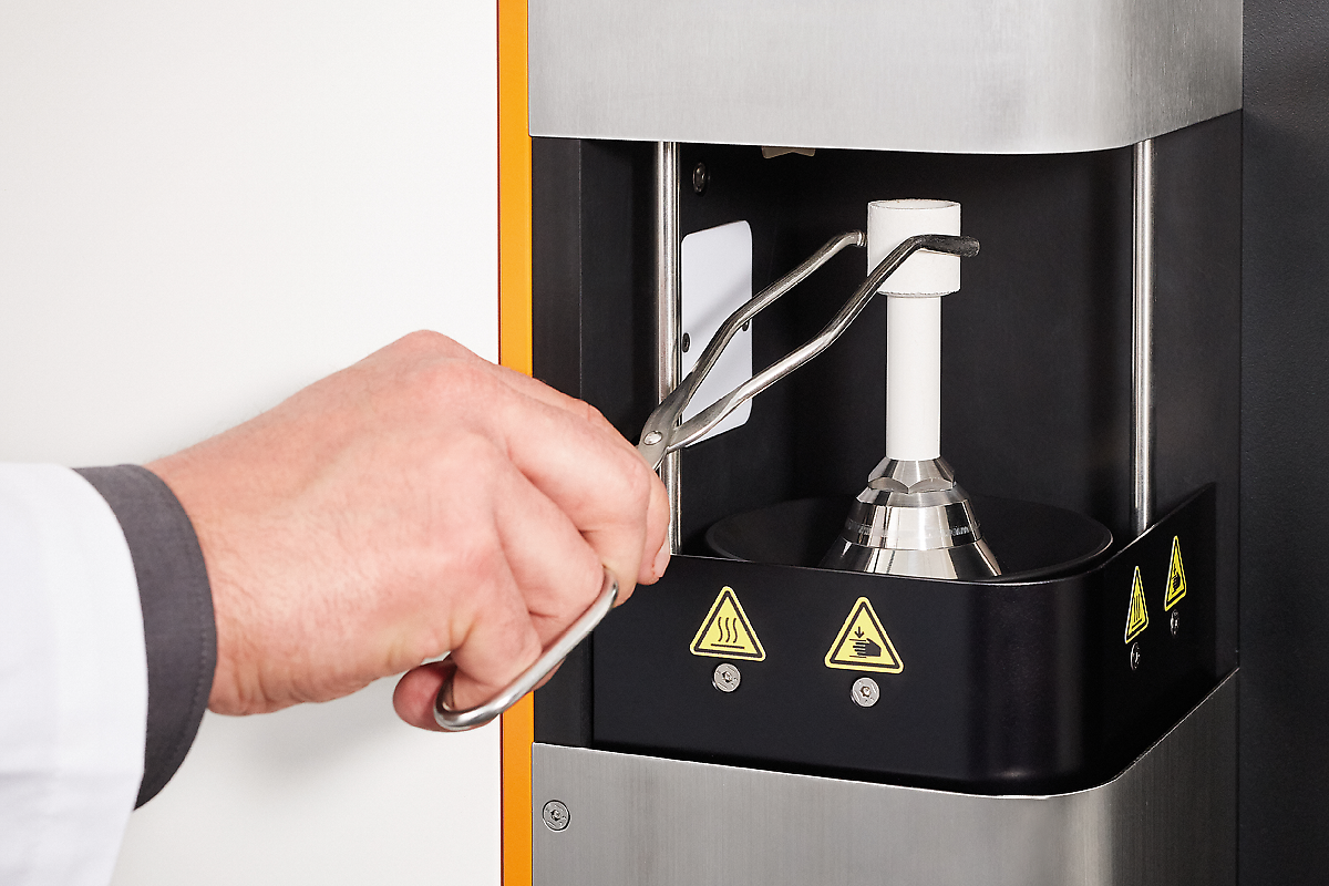 O cadinho de cerâmica é então colocado no pedestal do CS-d e a análise é iniciada através do software ELEMENTS. O software controla todas as etapas subsequentes, como combustão e avaliação.